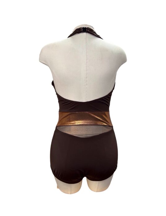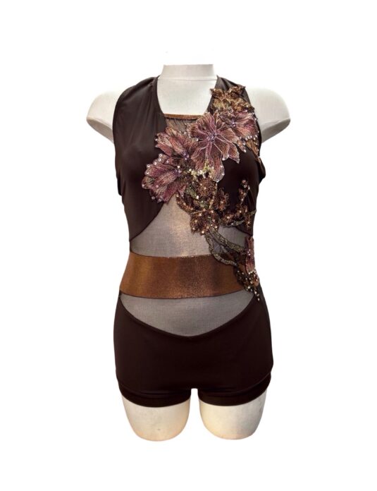 This beautiful two piece costume is made from lycra, mesh and beaded lace appliques. Top and shorts are both fully lined. Butterfly closures on the top.