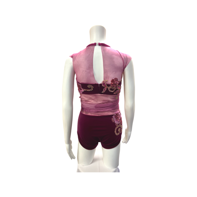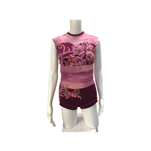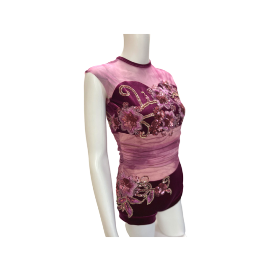 This beautiful bodysuit is made velvet and mesh, and features appliques. The bodysuit is fully lined. Perfect for your next competition.