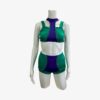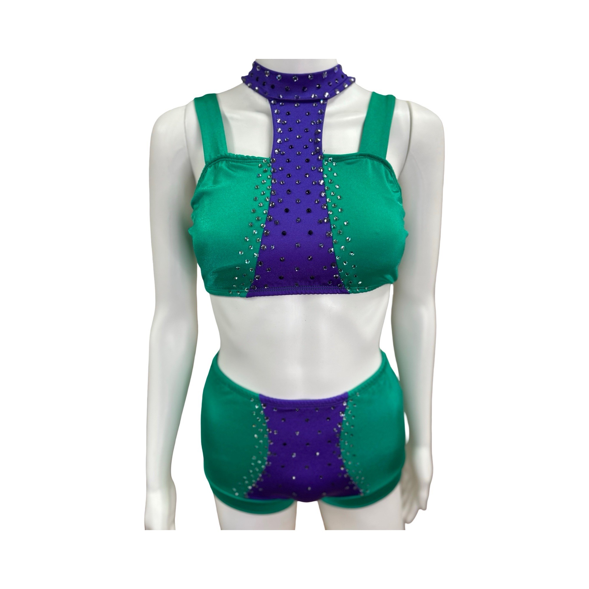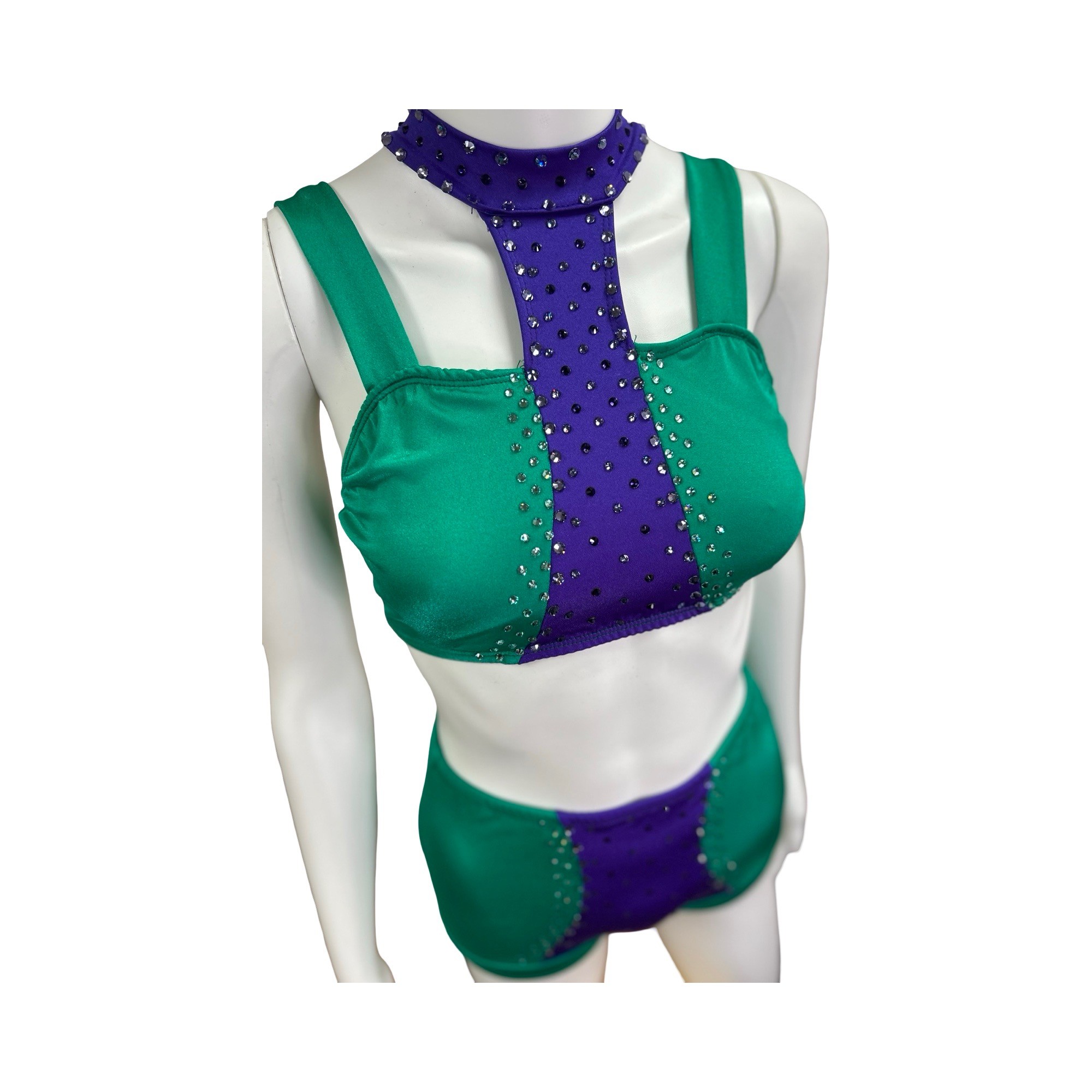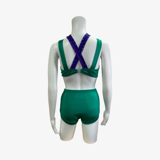 This fun and colorful two piece costume is made from stretch fabric in purple and green and features rhinestone detailing. Top and shorts are both fully lined. Butterfly closure on the top.