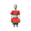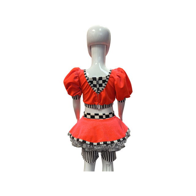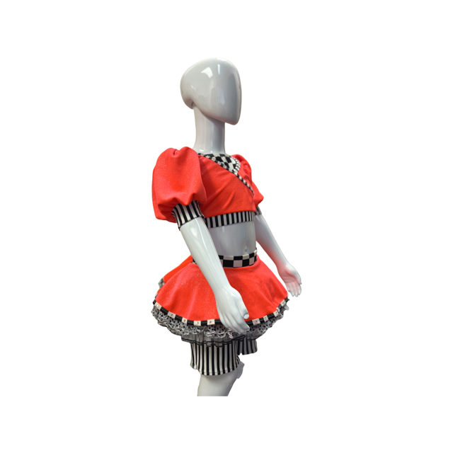 This cute costume is made from stretch fabric, velvet, and mesh, with some rhinestone detailing. It is the perfect costume for your child’s next solo!