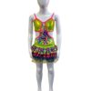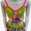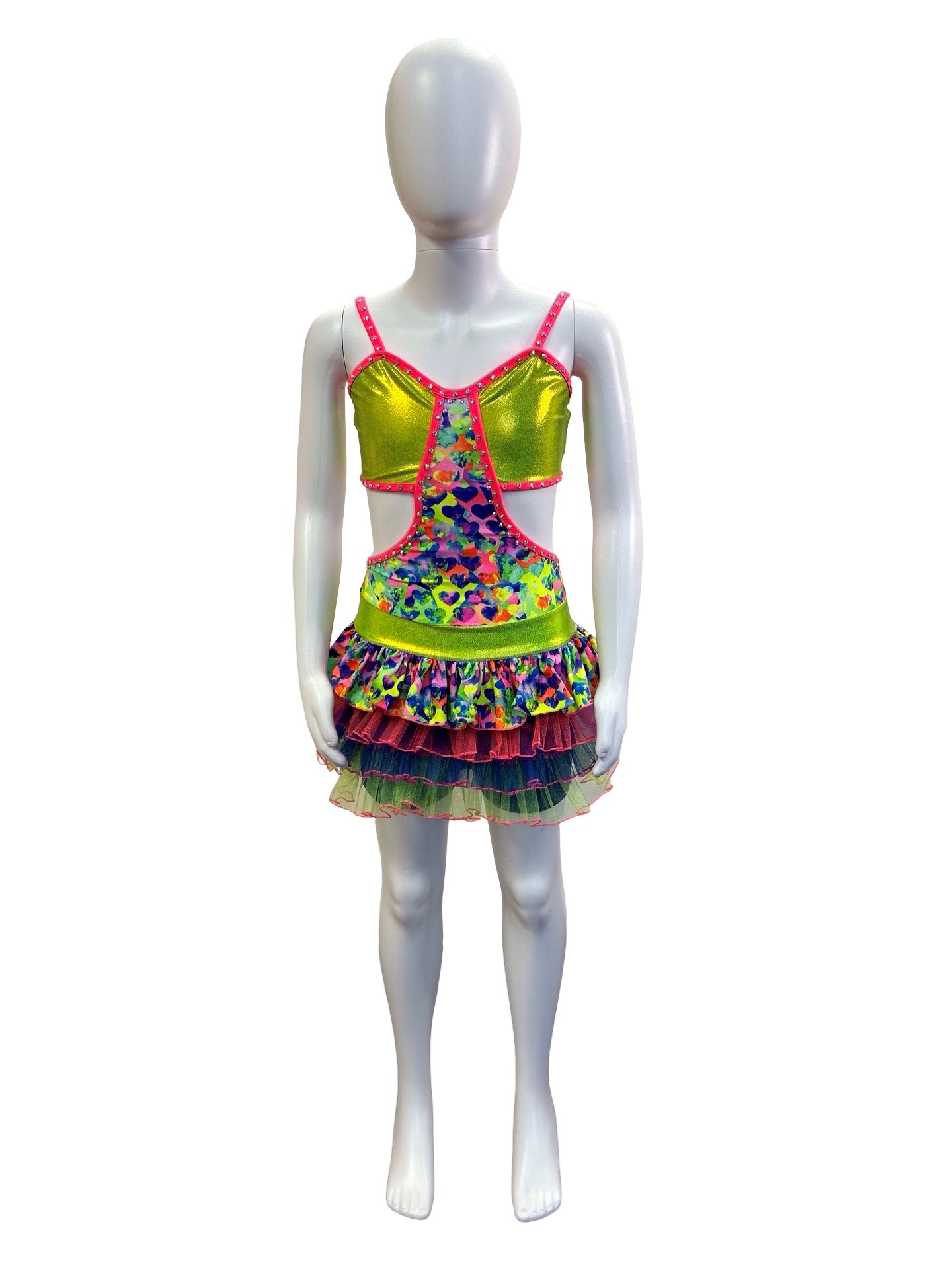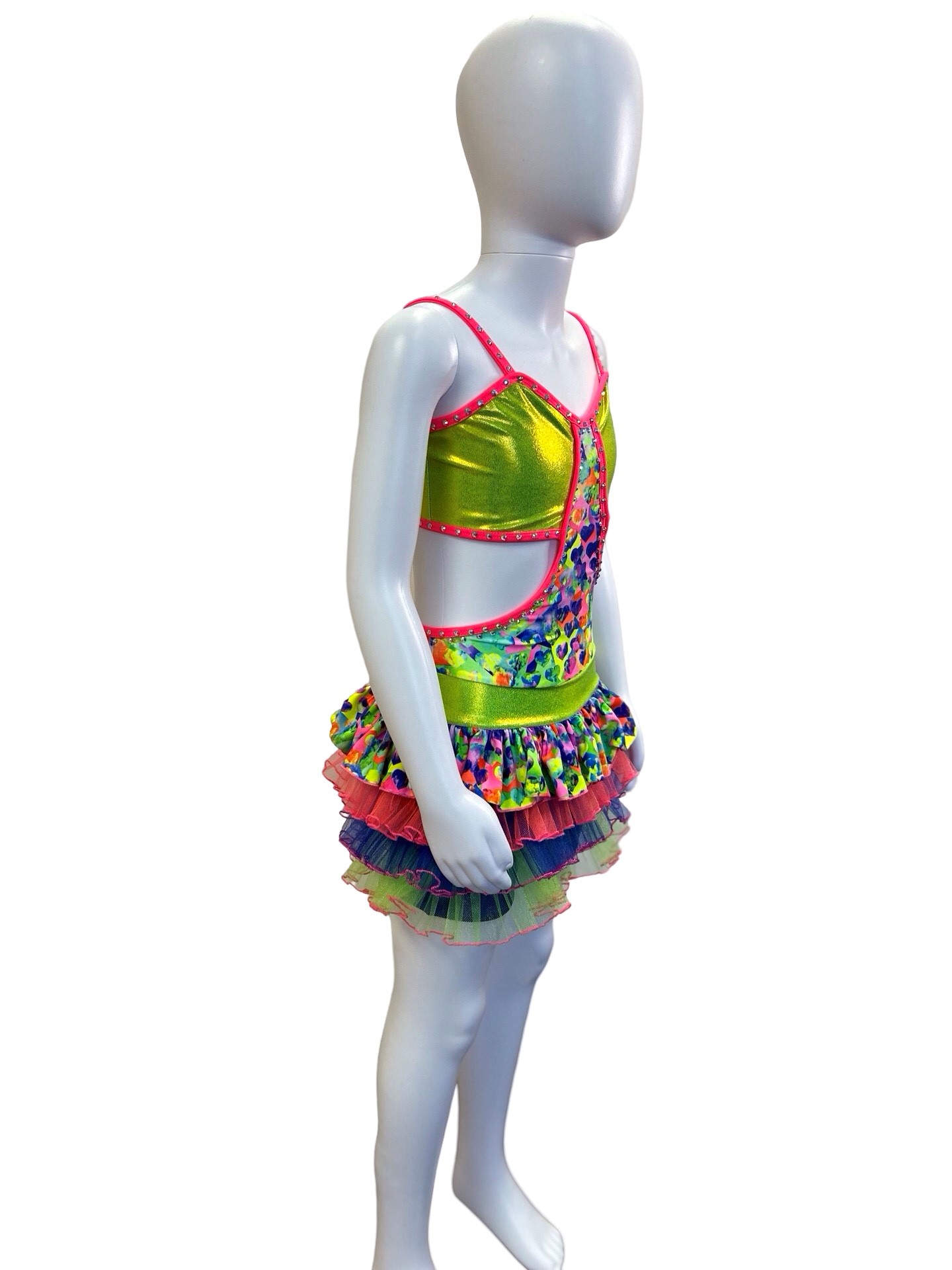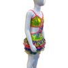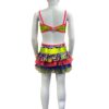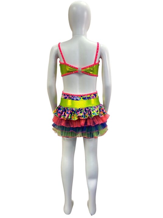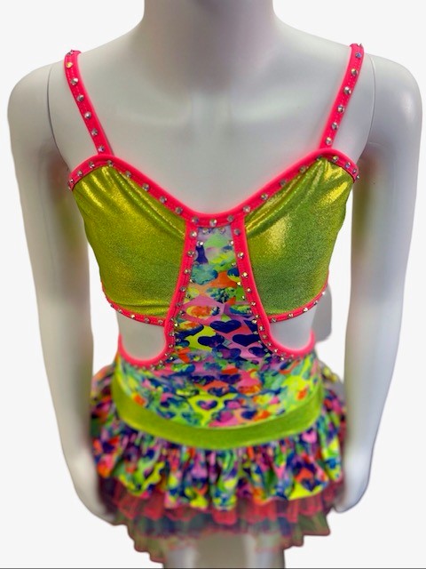 This is the perfect costume for your child’s next competition. This cute bodysuit has a multi layer ruffle skirt using various colors and types of fabric (lycra, tulle, print lycra). Also features bright pink binding, shorts under the skirt, and rhinestone detailing. Butterfly closure at the back of top.
