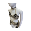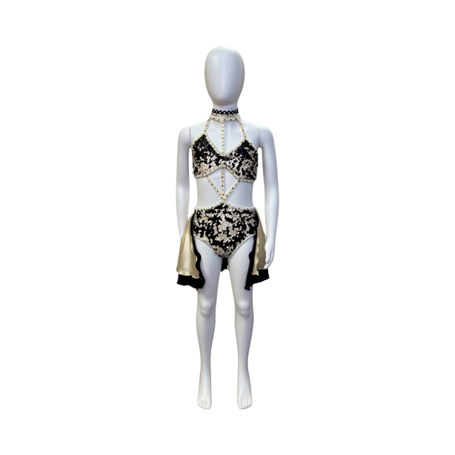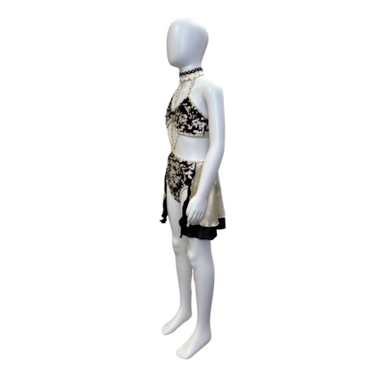 This solo costume features a cream/black sequins top and a two layer satin skirt. The costume is fully lined and has butterfly closures on the top. All straps feature rhinestones. Perfect for your next competition.
