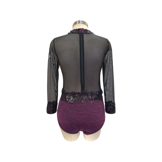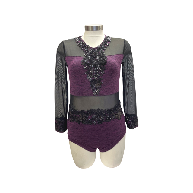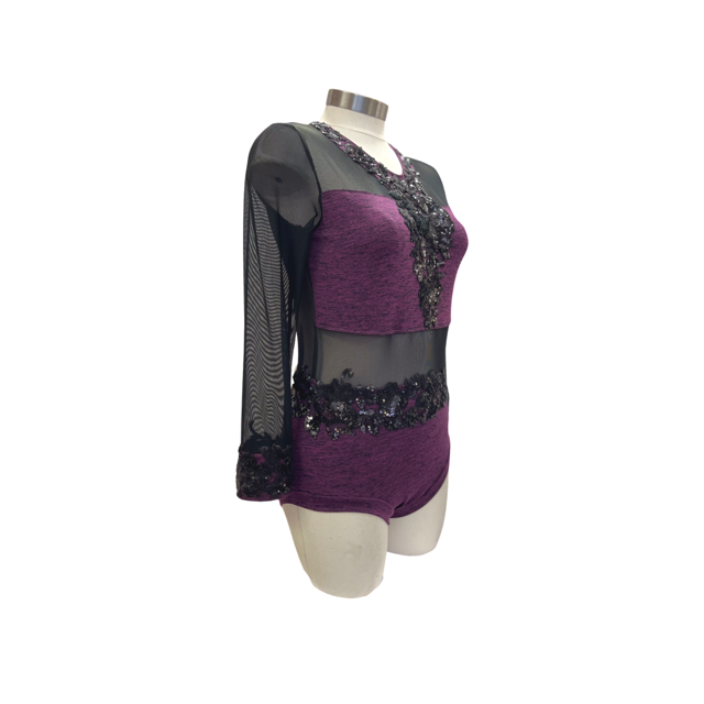 This gorgeous long sleeve leotard has black mesh cutouts and black lace applique that give it a mysterious edge. Perfect for your next competition.