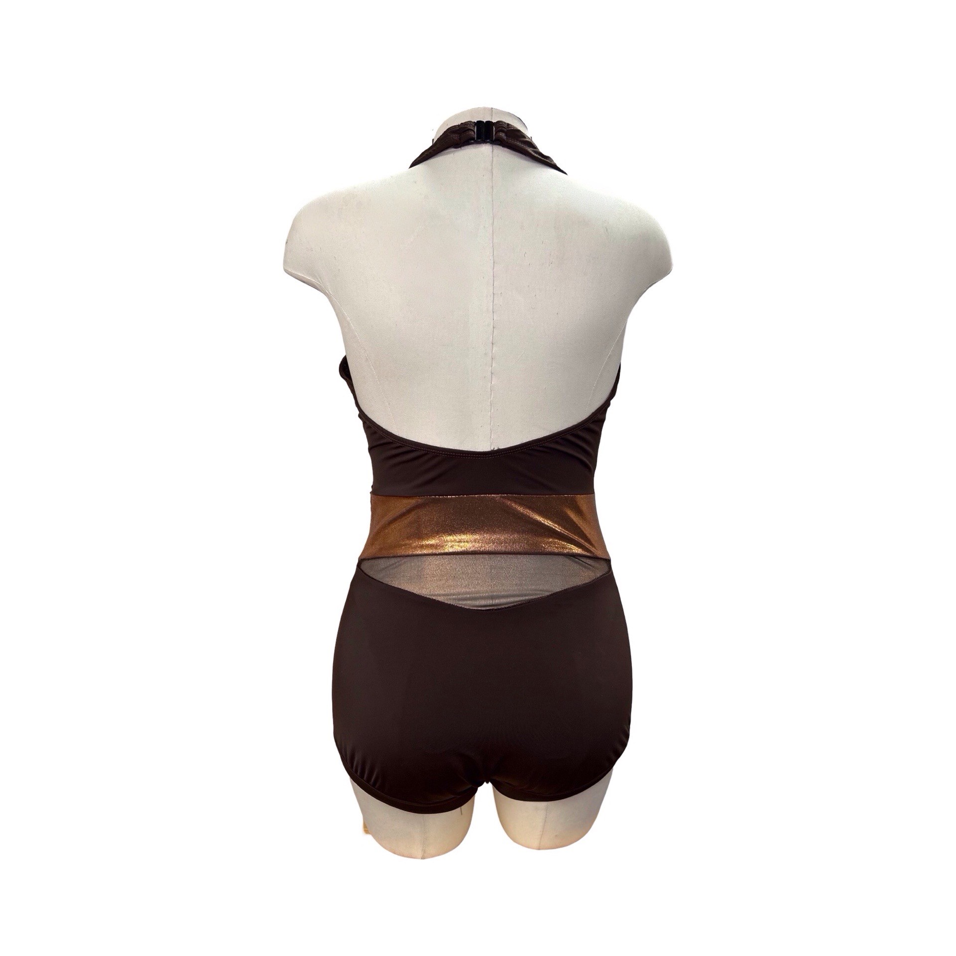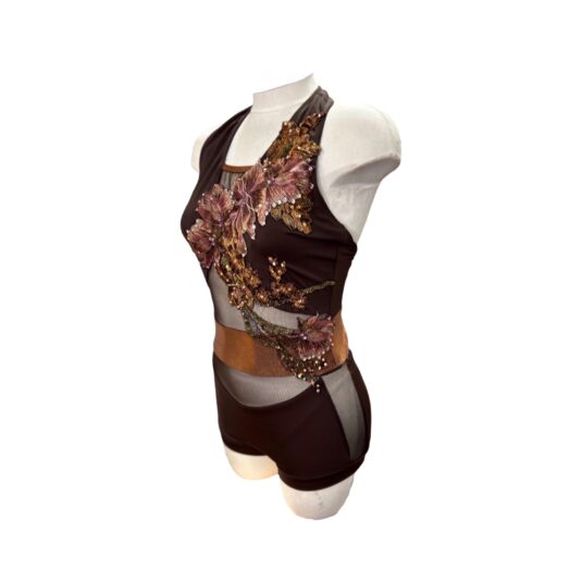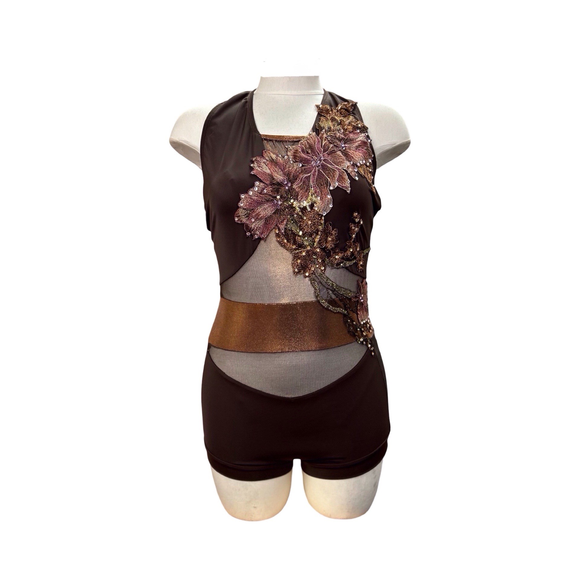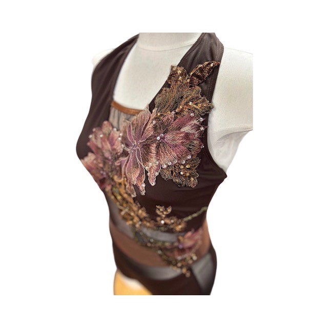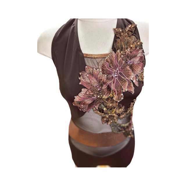 This beautiful costume is made from dark copper color stretch fabric and features flower appliques and rhinestones. The costume is fully lined and has a butterfly closure at the neck. Perfect for your next competition.