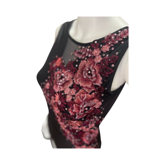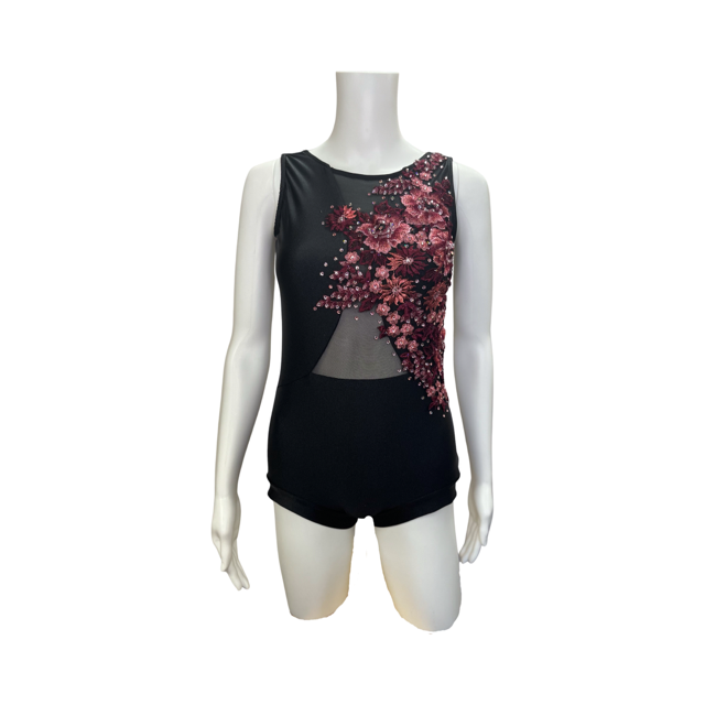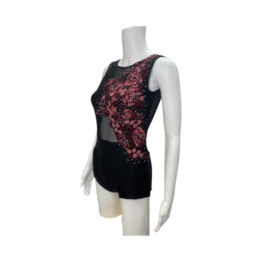 This beautiful bodysuit is made from Lycra and mesh, and features appliques and rhinestones. The bodysuit is fully lined. Perfect for your next competition.