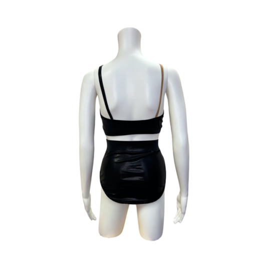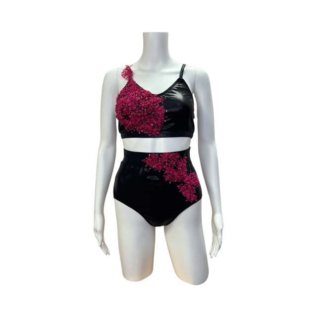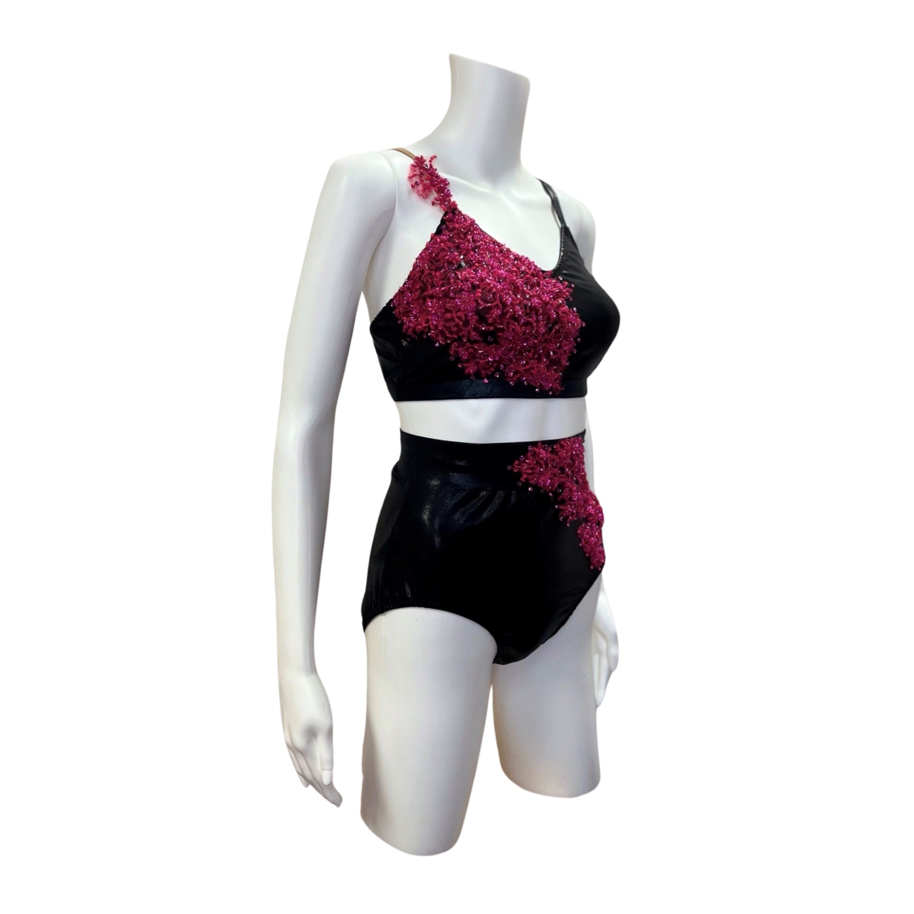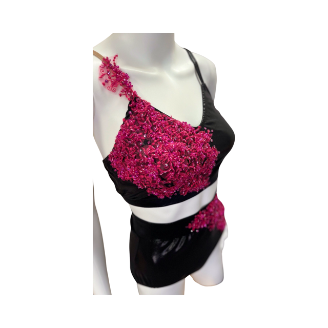 This beautiful two piece costume is fully lined and is made from mystique stretch fabric, and features beaded lace appliques on the front, and rhinestone detailing.