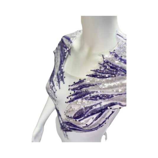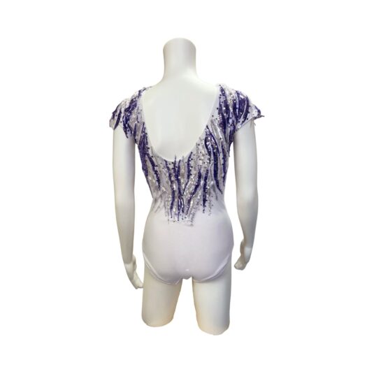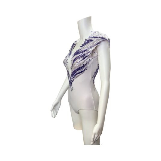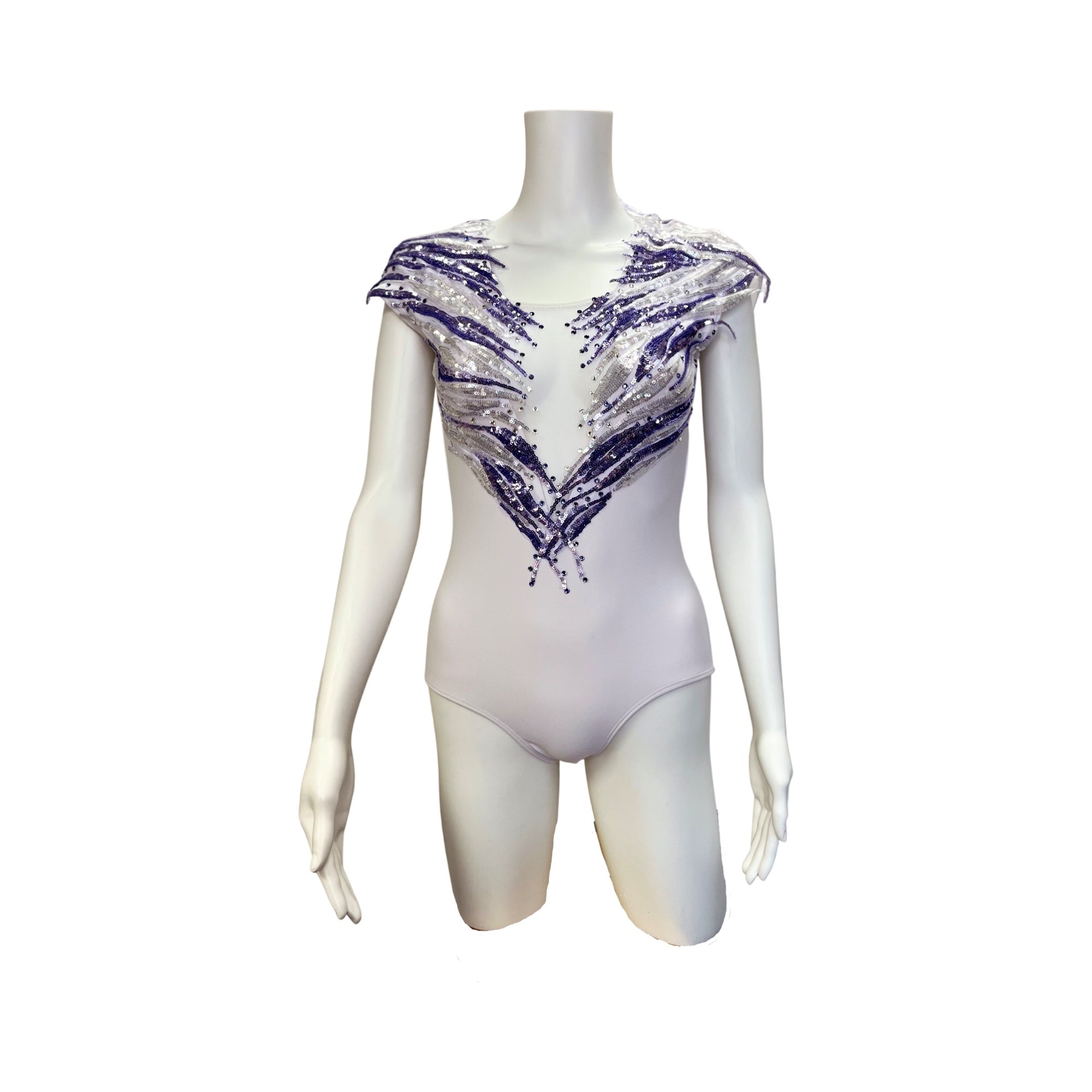 This beautiful bodysuit is made from stretch polyester/nylon fabric, mesh and sequin lace appliques. Costume is fully lined.