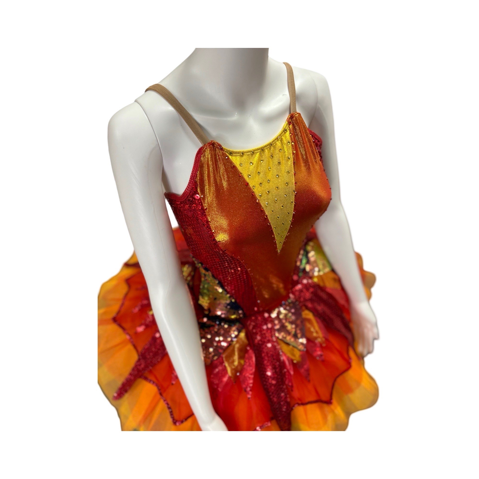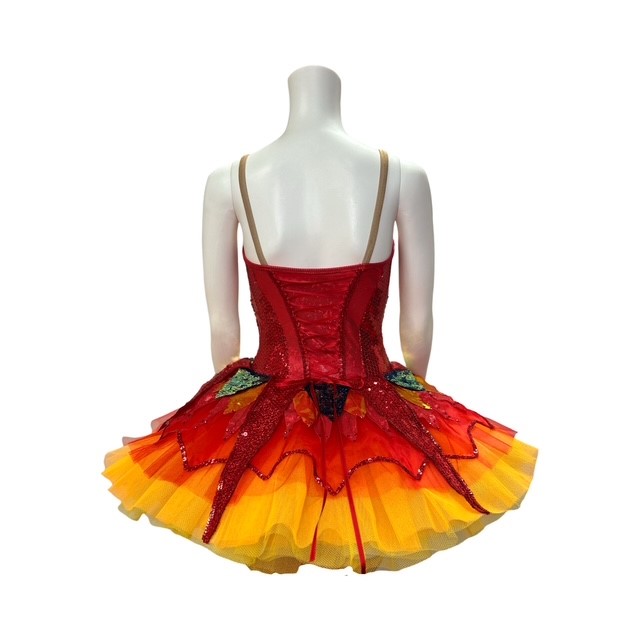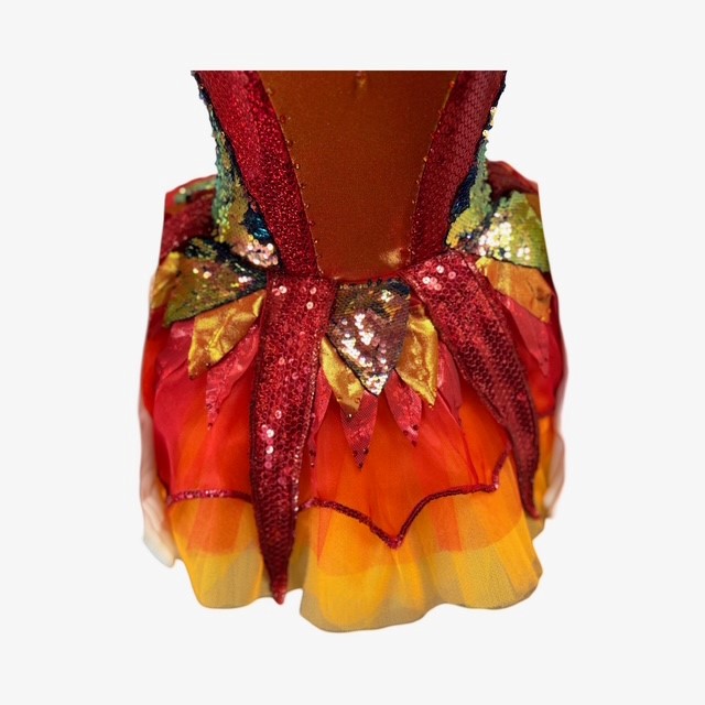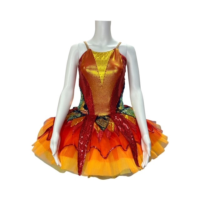 This costume is inspired by “Firebird”. This stunning tutu features a bodysuit made from stretch fabric and a tutu featuring sequin fabrics. Also features rhinestone detailing. Costume is fully lined.