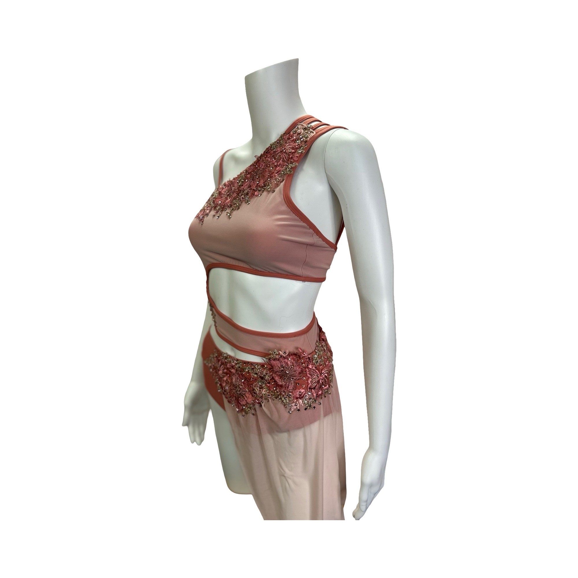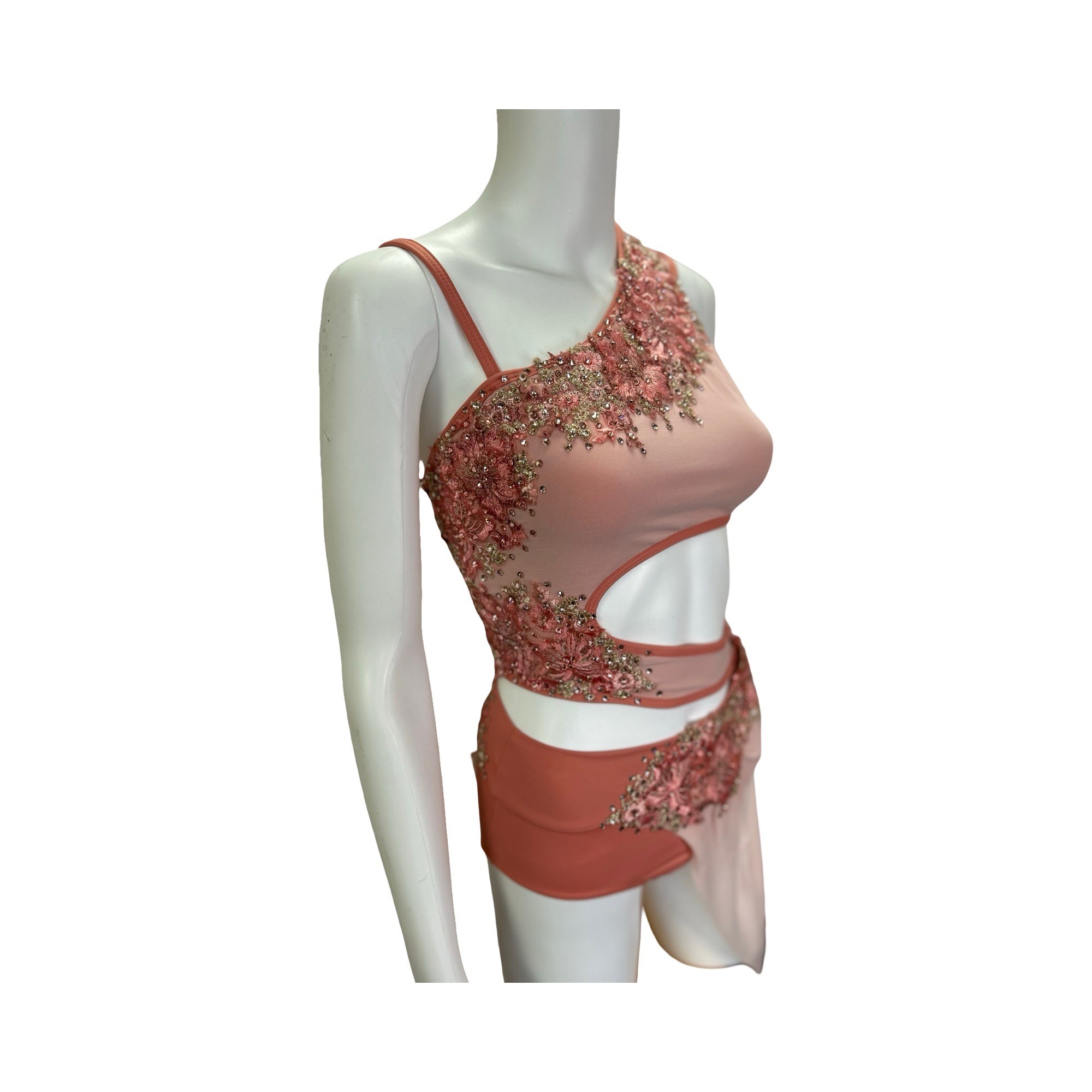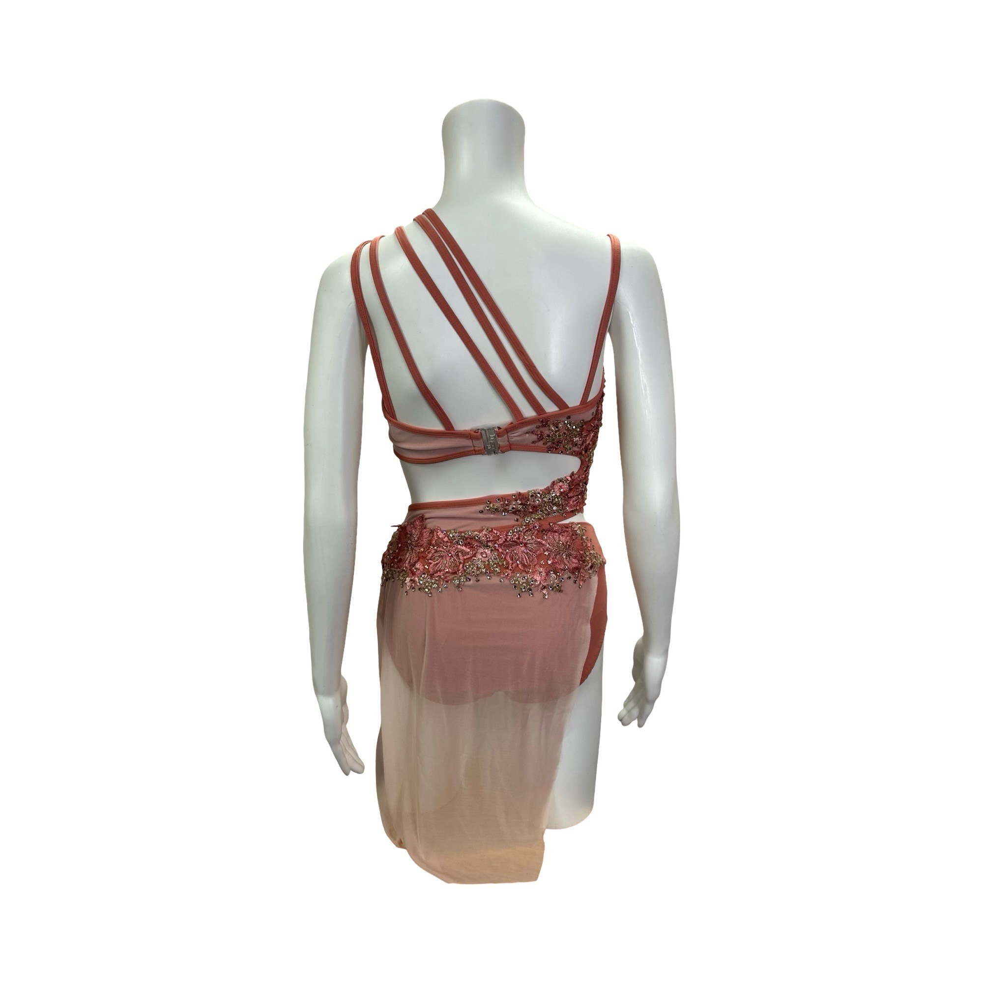 This beautiful peach costume is fully lined and is made from mesh and stretch fabric, and appliques and rhinestones. Also features a mesh skirt.