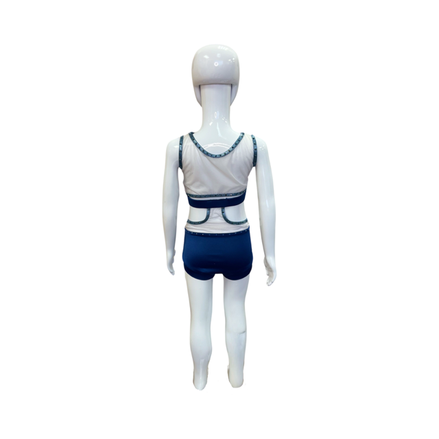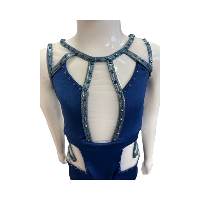 This beautiful navy bodysuit is made from stretch fabric and mesh, is fully lined and is the perfect costume for your child’s next routine. Features mystique binding and rhinestones.
